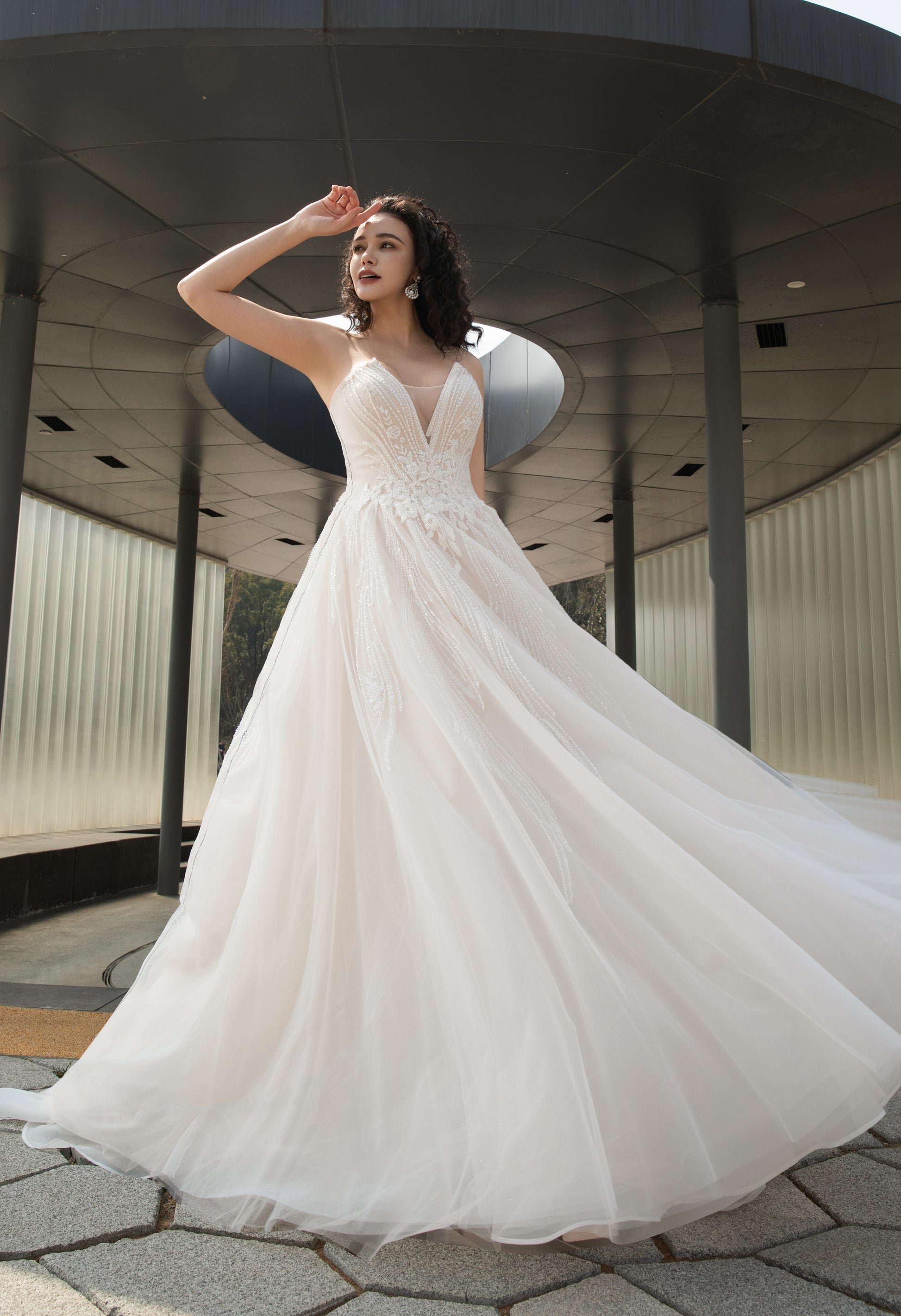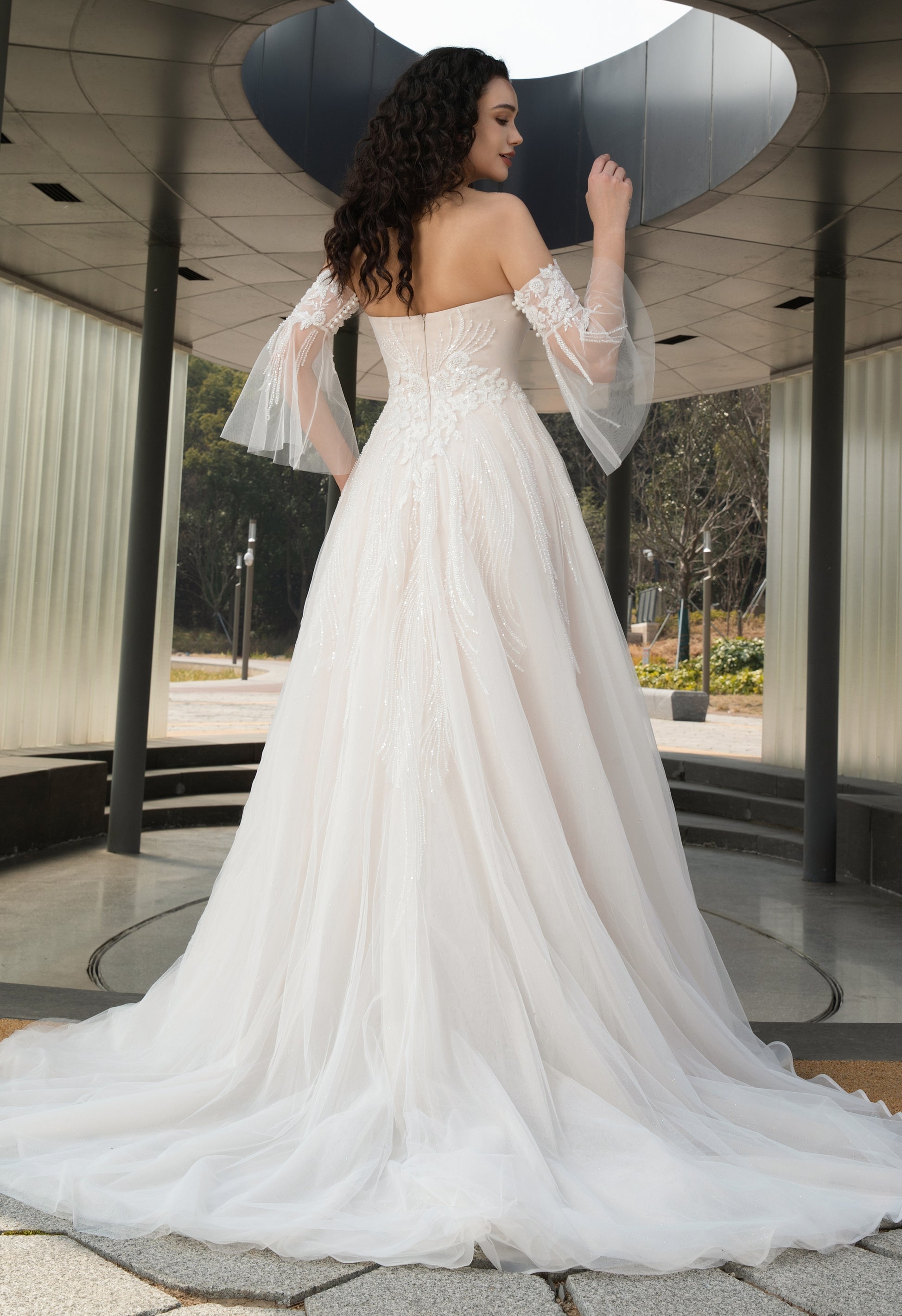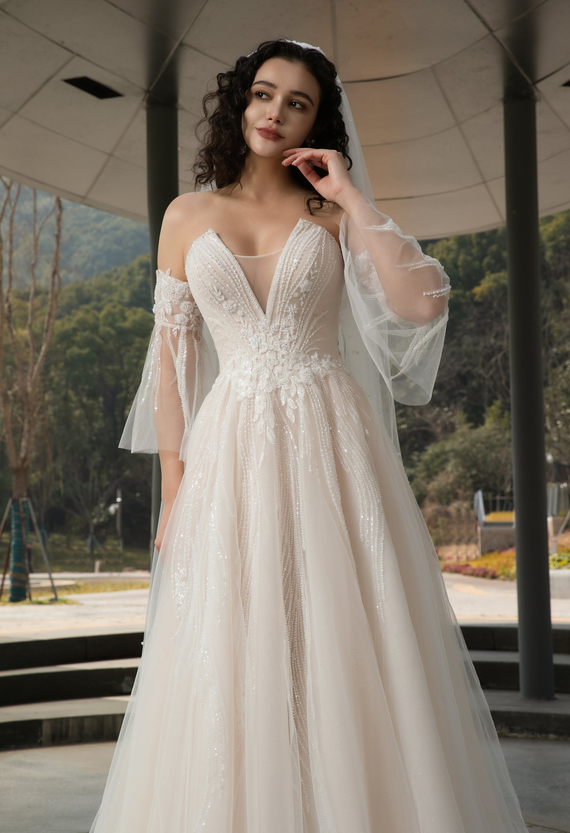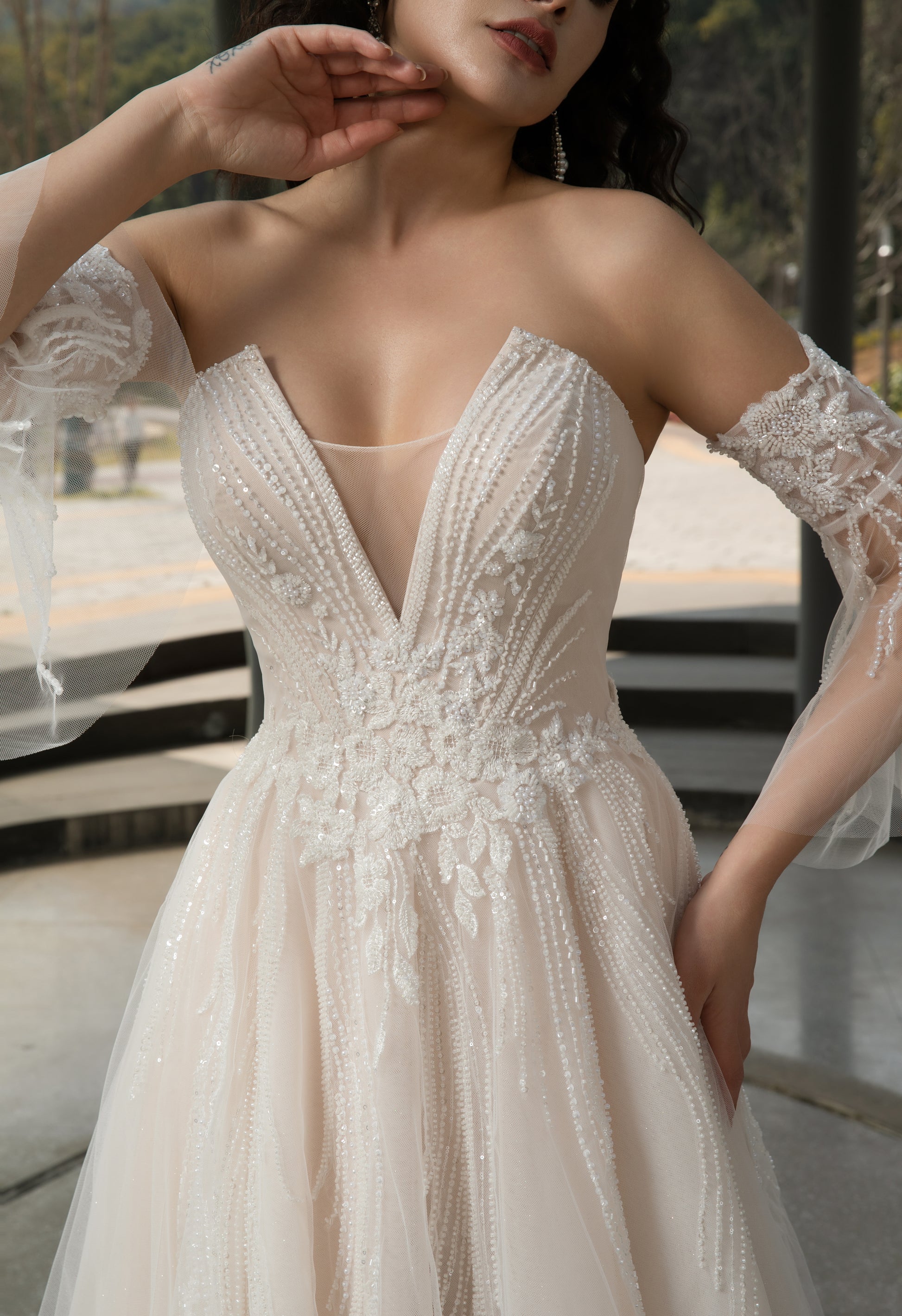 Exquisite heavily beaded Bridal gown with removable sleeves.