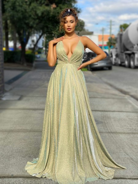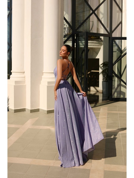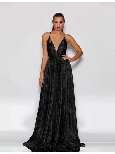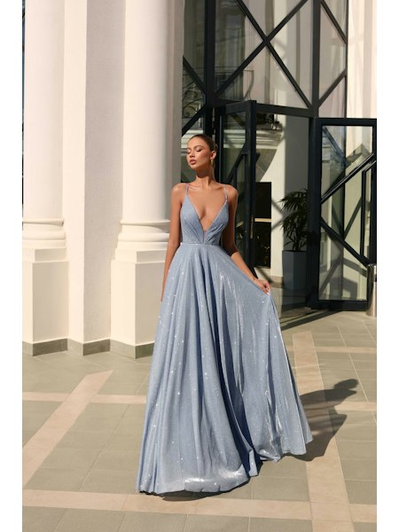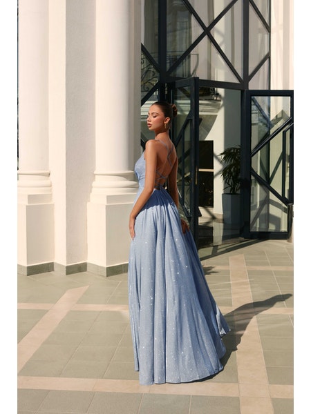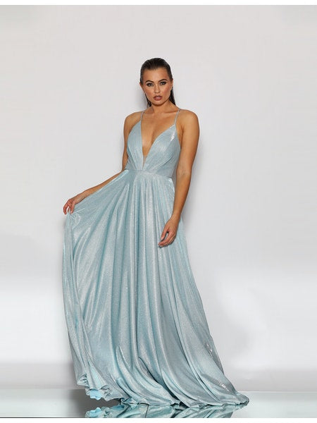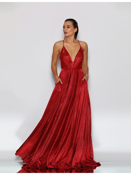 Very popular dazzling shimmer formal evening gown with open lace-up back and full skirt. Features hip pockets.