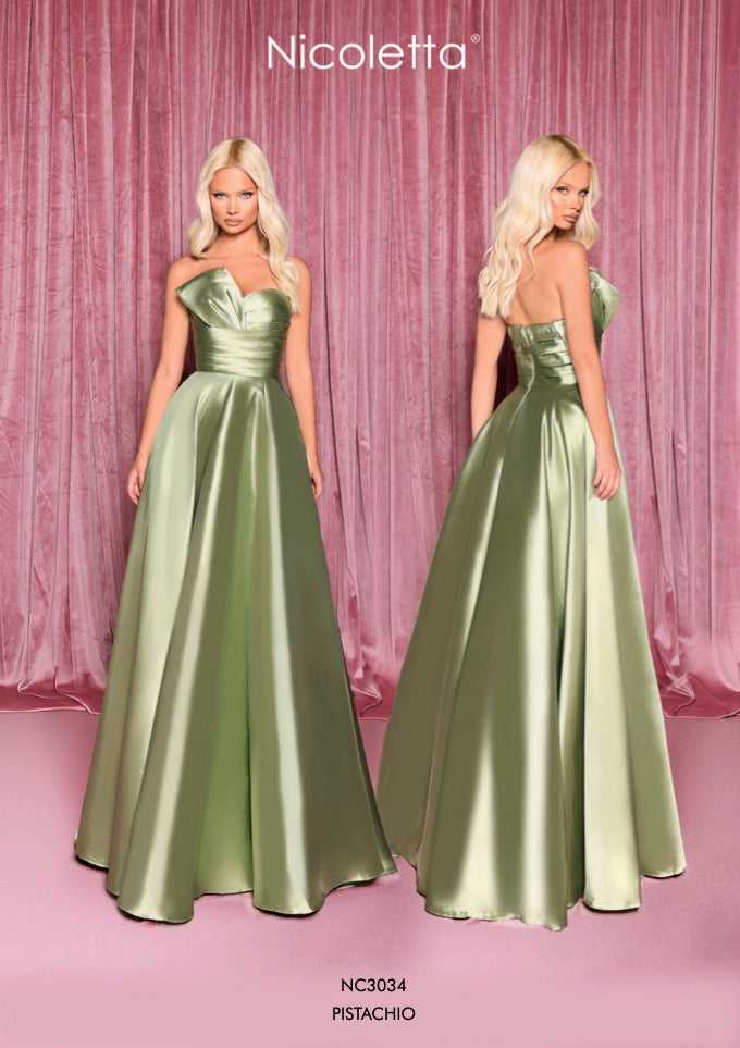 Sleek Mikado satin formal evening or bridesmaids gown with full skirt. Features thigh split and bow detail on bodice.