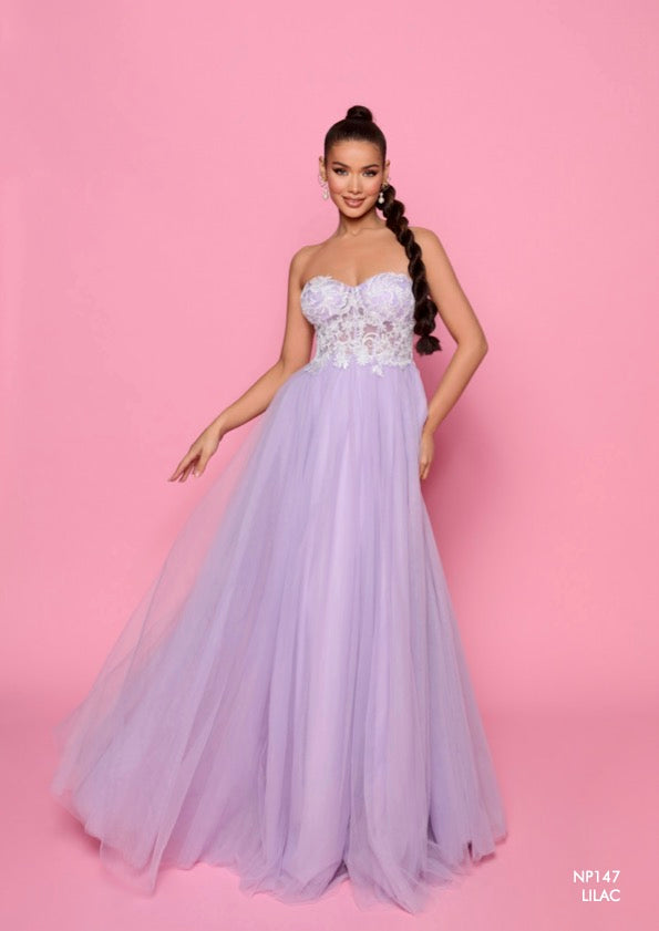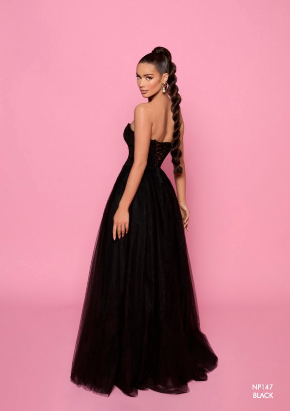 Feminine strapless princess gown with lace bodice and full tuille skirt. Features corset lace up back.